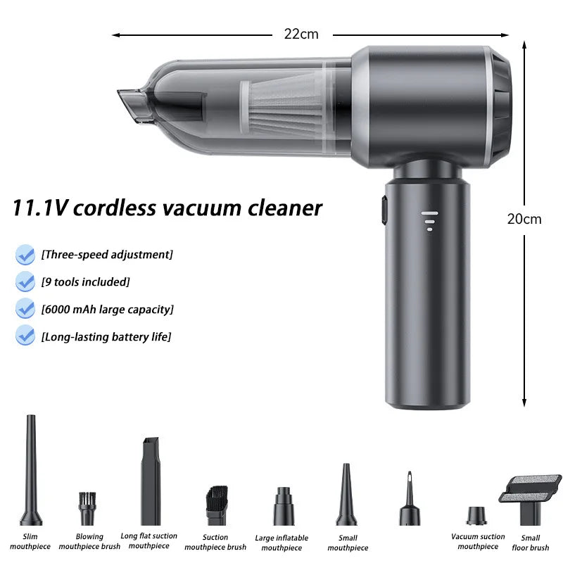 The Handheld Car Vacuum Cleaner is a small, powerful, and wireless device made to clean your car easily. It has strong suction power to pick up dirt, crumbs, and pet hair. It's small and easy to move around and store, making it a handy tool to keep your car clean with little effort.