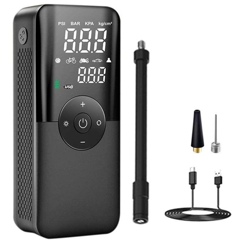 This Rechargeable Air Pump is a handy tool that helps you fill up car tires, bike tires, and sports balls with air. It has a small screen that shows you the air pressure, making it easy to use. You don’t need to plug it in because it has a rechargeable battery. It's small enough to store easily and perfect for emergencies or regular use. This pump is great for anyone with a car or who loves sports.